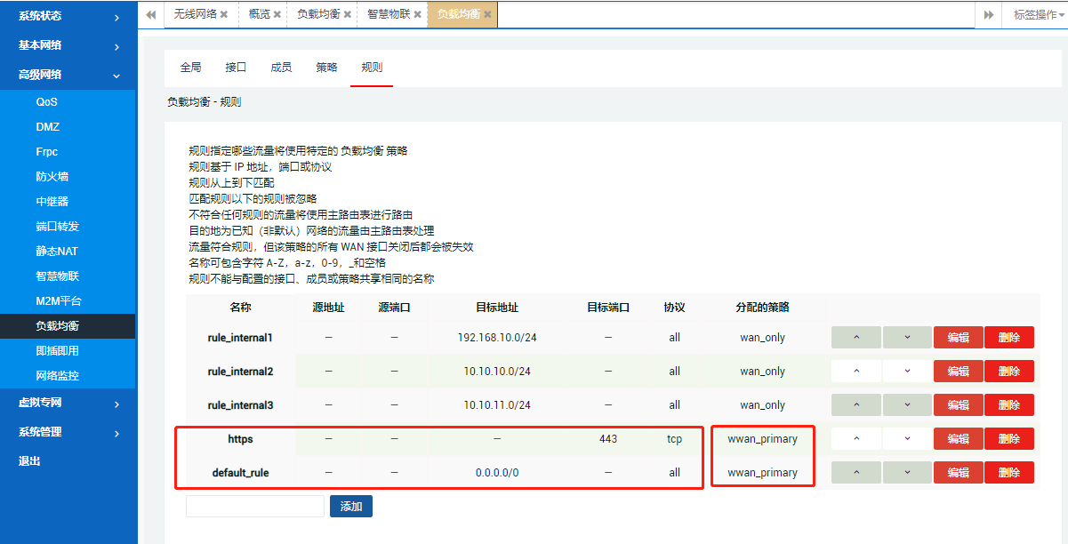将如下默认的两个选项策略都修改为wwan_primary,即启用无线wwan优先,4G备份规则,分别如下: 4.5.开启负载均衡功能