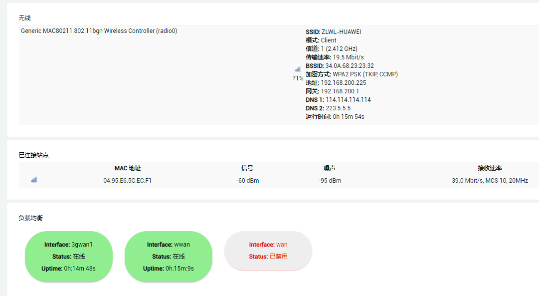 1)选择 “基本网络”—“无线网络”,点击“扫描”,找到要加入的无线网络,并输入WiFi密码后,依次点击“提交”和“保存应用”即可,分别如下: 图片8.png图片9.png图片10.png图片11.png图片12.png 2)选择“系统状态”–“概览”页查看无线客户端的ip地址连接状态,成功如下:图片13.png 4.负载均衡页面配置无线客户端wwan(新版本默认已预置好wwan相关参数,则跳过4.1-4.3配置内容)
