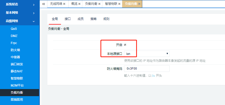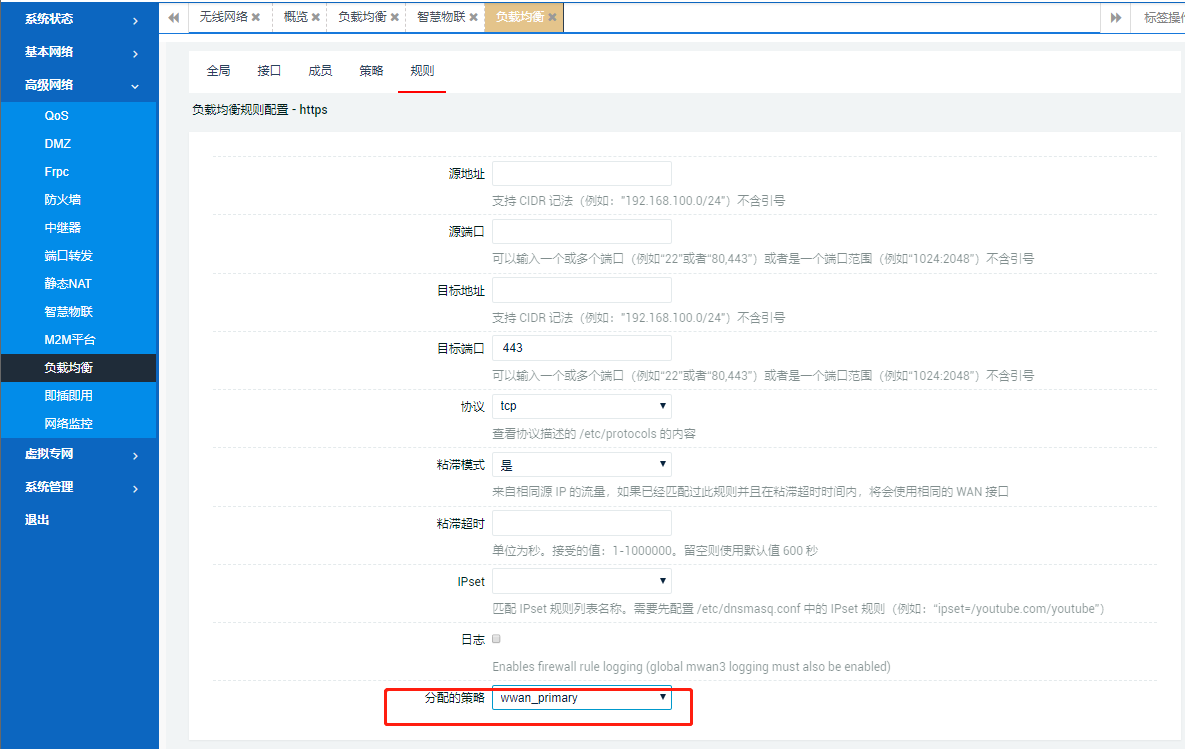因为要使用WiFi优先,4G备份,所以设置名称为wwan_primary,同时必须关联成员wwan_m1_w1和3gwan1_m2_w1;分别如下:图片22.png图片23.png图片24.png 4.4设置负载均衡控制规则